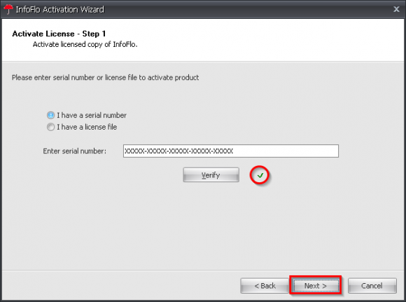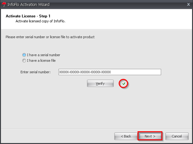 'Verify'(Your license will be associated to this server computer and cannot be installed on another computer). - There will be a small green check mark next to the verify button when the verification is complete. Click