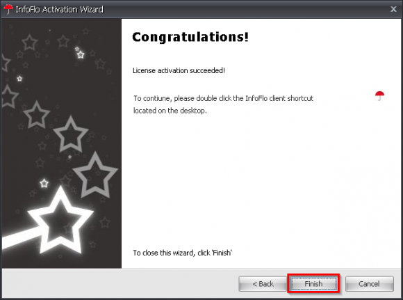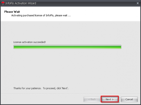 'Finish'to complete the activation and close the'InfoFlo Activation Wizard'window.