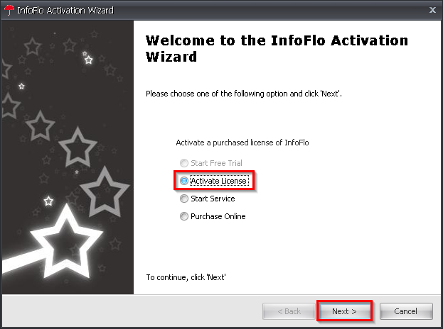'InfoFlo Activation Wizard'appears, select'Activate License'and click'Next'. - The