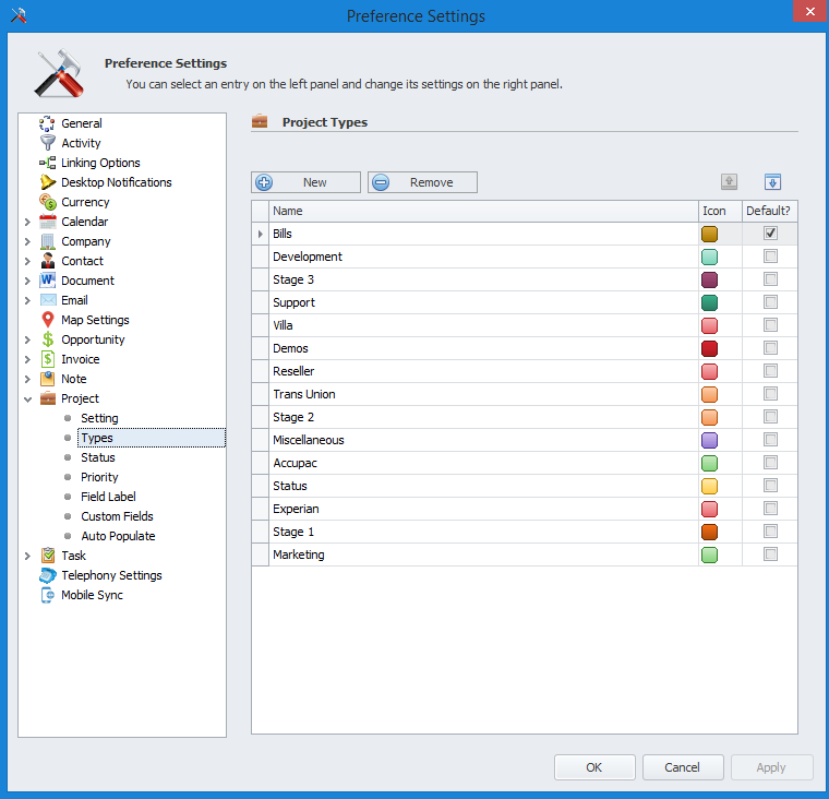 'Types'click'Add'to add a Project Type. - Enter a Name for the Project Type and select a coloured Icon.