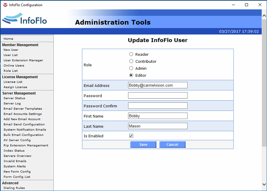 'Is Enabled'field to disable a user. ***Note*** A user can only be disabled not deleted. - Click
