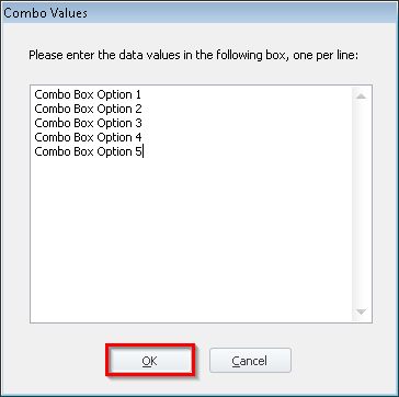 'Combo'as your Data Type and the following window will appear. Type each of the values separated by a line break (Enter). - Click