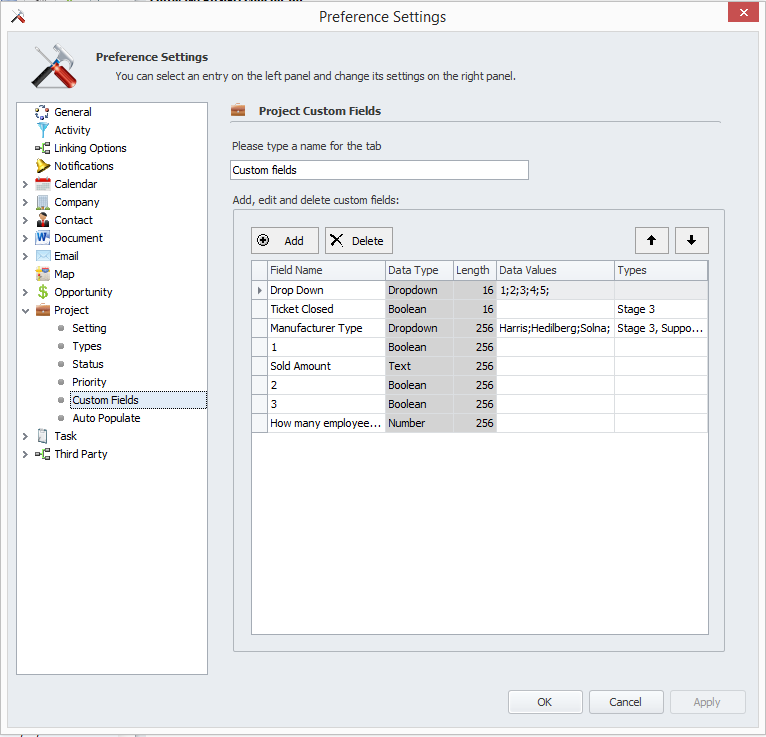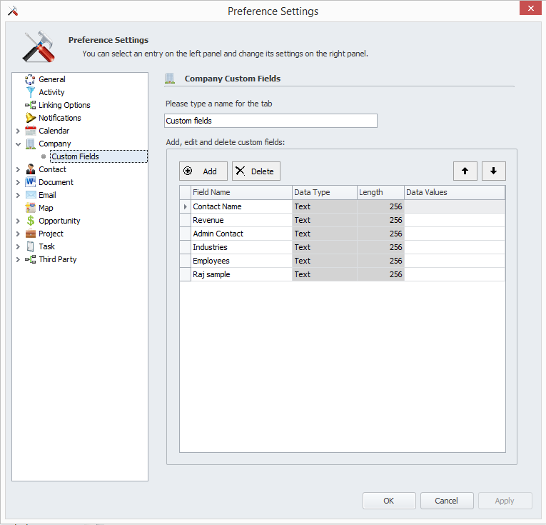 'Contact, Company or Project'from the left navigation tree. Click'Add'to add a Custom Field for Contacts.