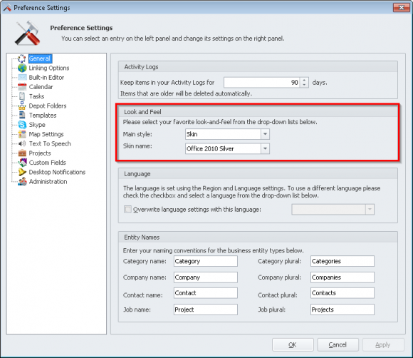 3. Under 'Look and Feel' select the 'Main style' and 'Skin name' you would like to use.