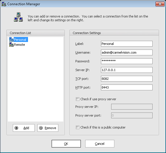 Label:Name of your connection.Username:Email address of the InfoFlo user.Password:InfoFlo password.Server IP:IP or Hostname of InfoFlo server (ie. 192.168.1.100, InfoFlo-PC). If you are accessing InfoFlo from the server computer, you can put 127.0.0.1 which will point to localhost. You need to ensure that the IP of the server is static, which means it will not change the next time you wish to connect. Your technical staff will be able to help you set that up. If accessing from a remote location, the server IP will have to be static or a dynamic dns hostname can be created and inputted in this text box.TCP port:8082 is the default TCP port for InfoFlo. This port must be opened in the computer’s firewall it order for InfoFlo Server to be accessed. In order for InfoFlo Server to be accessed from outside the network (from a remote location) port 8082 will also have to be opened in the router firewall and directed to the server (or other pieces of networking equipment that may be blocking this connection).HTTP port:8443 is the default HTTP port for InfoFlo.Check if use proxy server(not necessary to configure in most situations) – This is checked if you need to connect to InfoFlo Server via a proxy server.Proxy server IP:IP for proxy server.Proxy server port:Port for proxy server.Check if this is a public computer– This is checked when InfoFlo is accessed on a public computer. InfoFlo’s cache will be deleted on exit. Please leave this box unchecked on a trusted computer.- Click