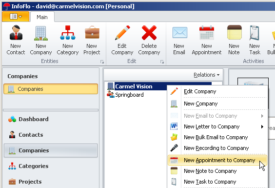 'New Appointment to Contact'. - To add a new appointment to a Company, right click the Company and click