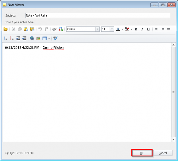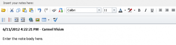6. Enter the note body in the large text area below. (InfoFlo automatically prepends the current date/time along with the name of the current user.)