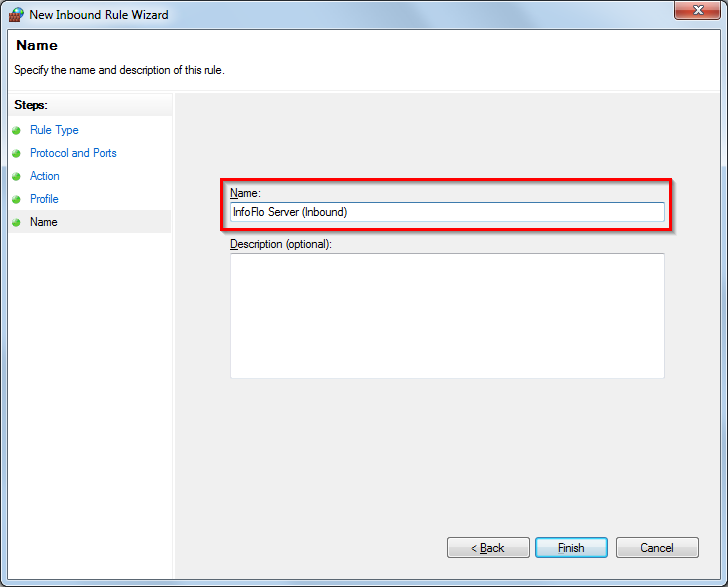 - Enter a name for your Inbound Rule. Click Finish.