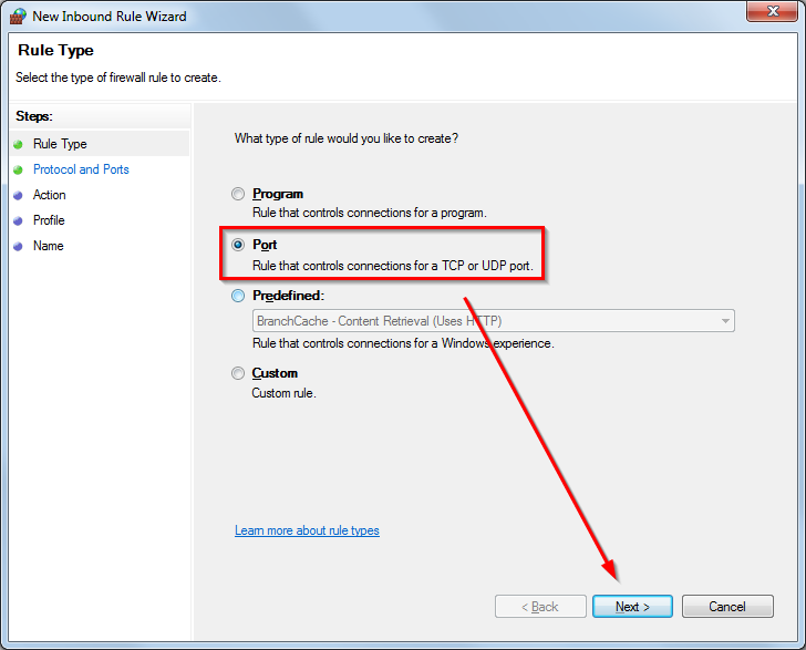 - Select ‘Port – Rule that controls connections for a TCP or UDP port.’ and click Next.
