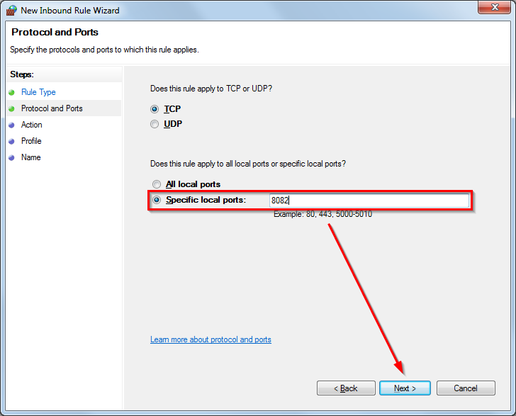 - TCP as selected by default is correct. Enter 8082 in the text field next to ‘Specific local ports:’. Click Next.