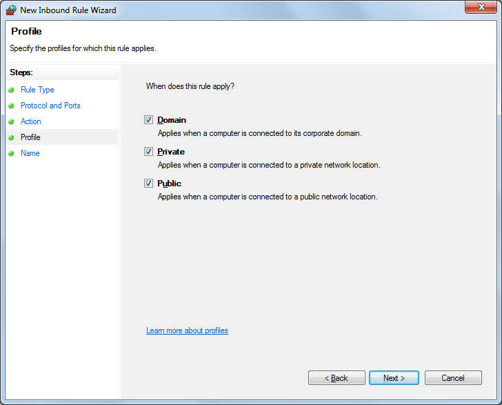 - Select the correct profile for this rule and click next. (Default is okay in most cases)