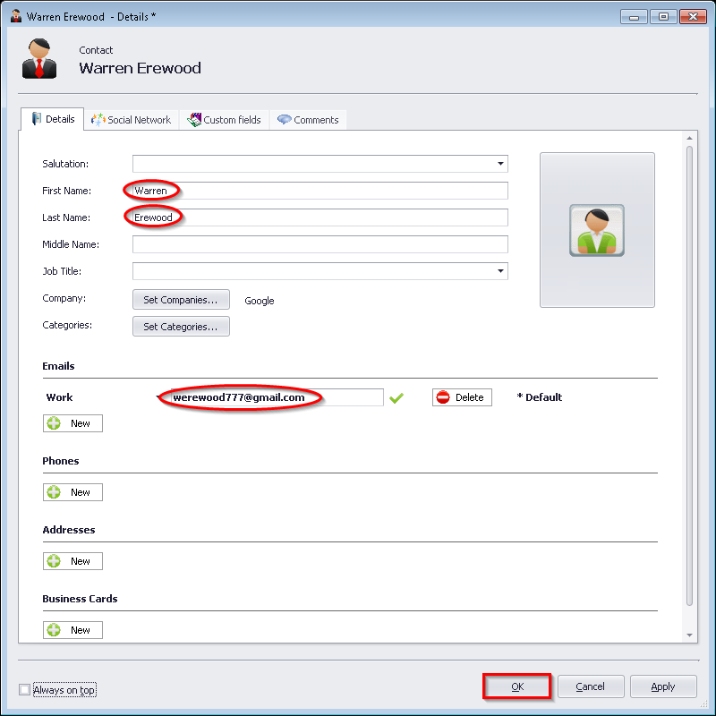 - A New Contact form will be opened with the First Name, Last Name and Email Address already filled in. Click