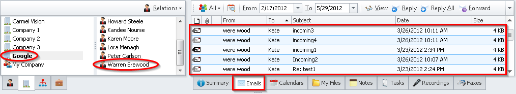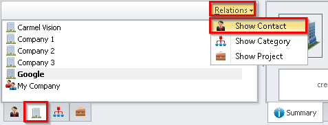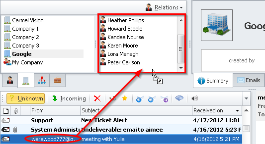 'Company'button to view the list of companies in the top left panel. Select the company you would like to link the contact to. Click'Relations'and select'Show Contact'to show the contacts that are linked to the company. - Drag-and-drop the unknown email to the contacts side of the top left panel.
