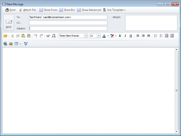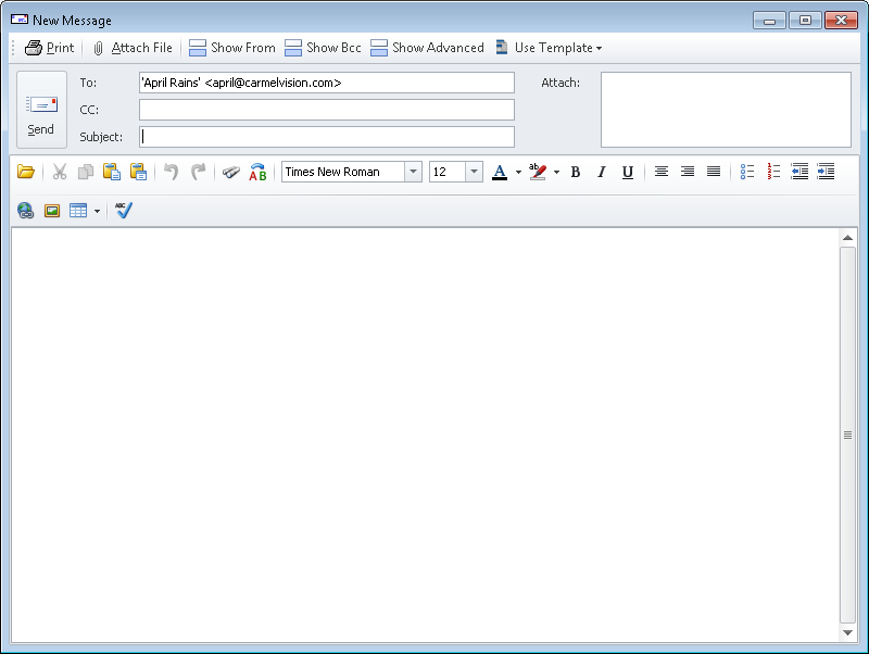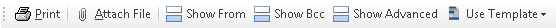'Print','Attach File','Show From','Show Bcc','Show Advanced','Show Advanced'and'Use Template'. - Below the tool bar is the