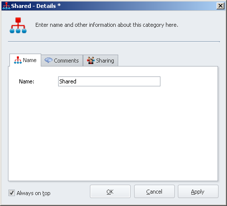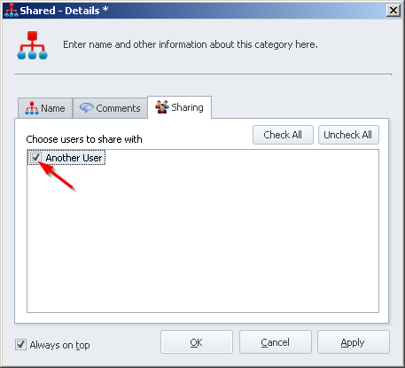 'Sharing'tab, check the users you would like to share the category with under'Choose users to share with' - Click