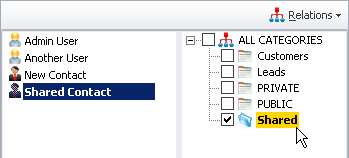 'Relations'and select'Categories'to open up the dual panel view (showing both Contacts and Categories at the same time). - To share a contact, simply select the Contact that you would like to share from the left panel, and check off the shared category in the right panel.