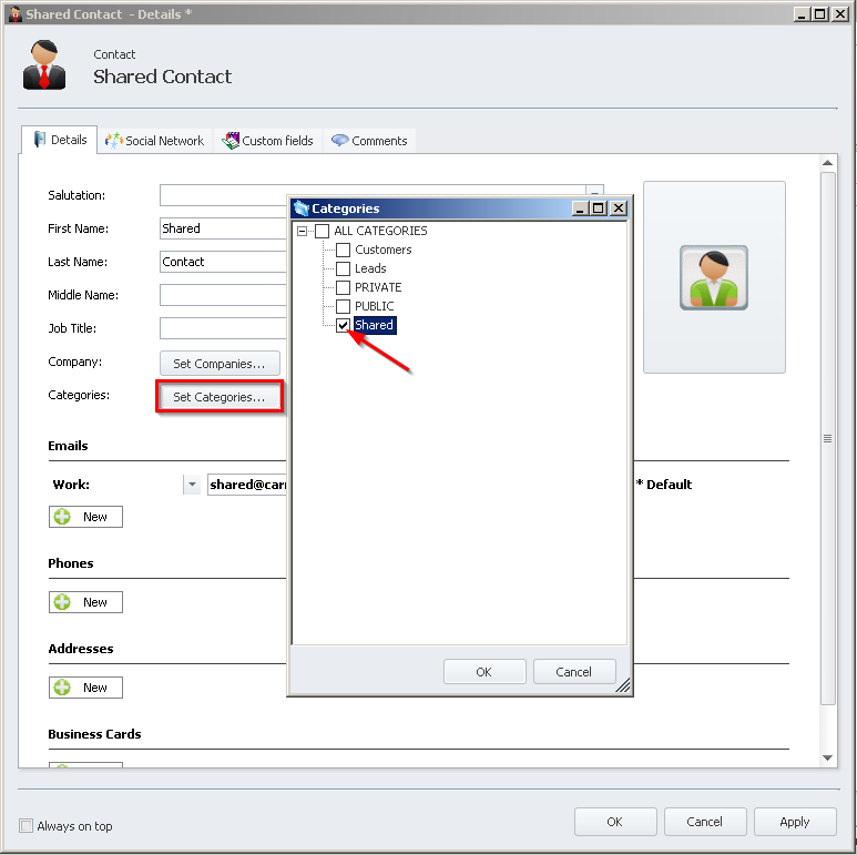 'OK'to add the category. - Click the contact you would like to share -> Click