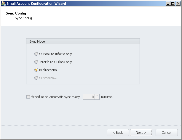 'Schedule an automatic sync every x minutes'check box to keep InfoFlo to synced to Outlook automatically. Enter the number of minutes you would like to wait before InfoFlo attempts another sync. - Click