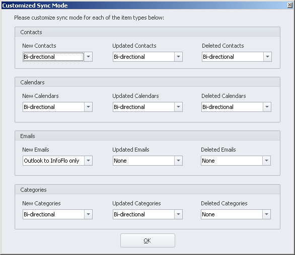 - InfoFlo to Outlook only – All data to be synced from InfoFlo will be synced to Outlook. WARNING: Outlook data will be DELETED if it does not exist in InfoFlo