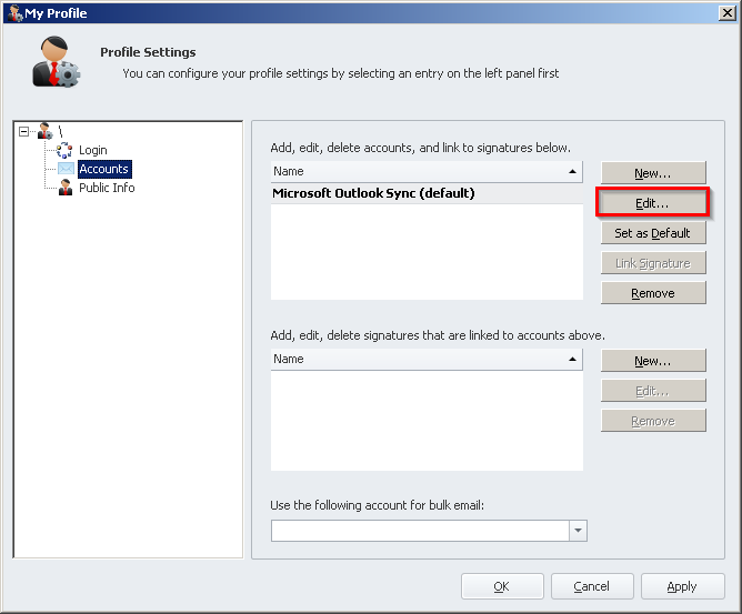 Accountsfrom the left-hand tree menu -> Select your'Microsoft Outlook Sync'account -> Click'Edit'to edit your Outlook account. - Click