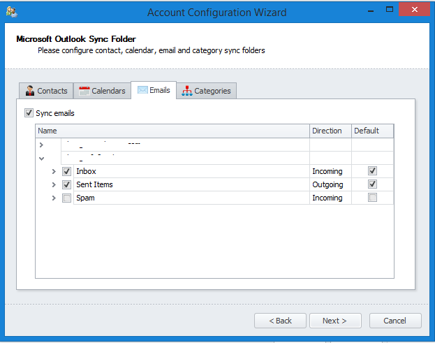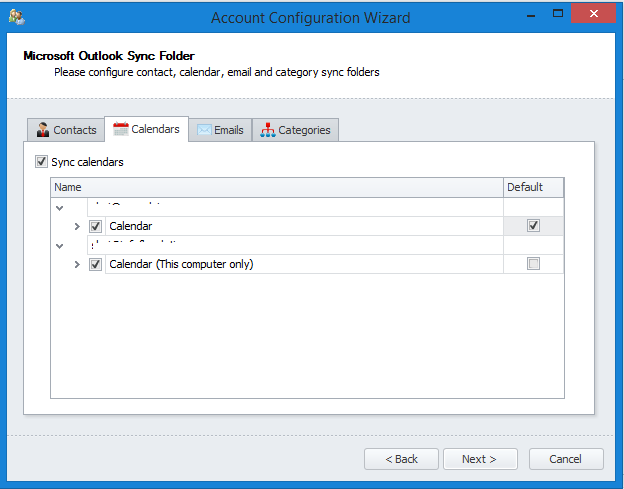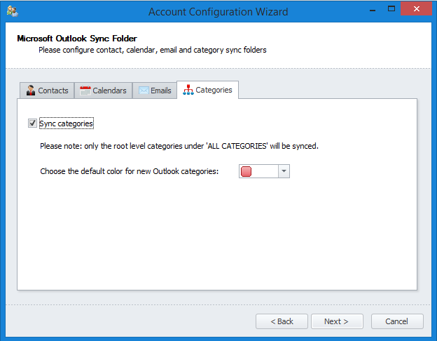 'Sync contacts','Sync calendars'and'Sync emails'are automatically checked (they will be synced when this account is added). - To sync categories check the