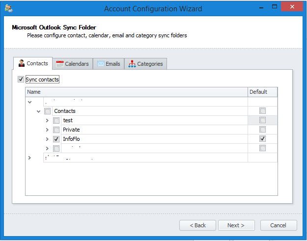 'Sync categories'check box on the Categories tab. - To sync contacts, ensure that the