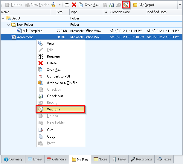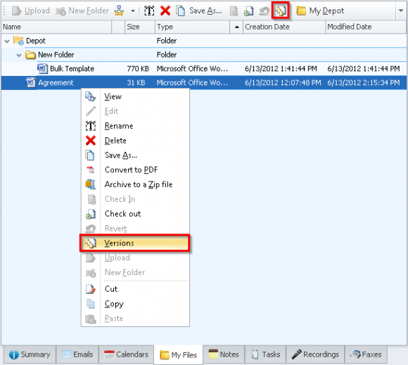 'Versions'or click the'Version History'button available on the My Files toolbar. - Here you can view a list of all the revisions made to the document or file.