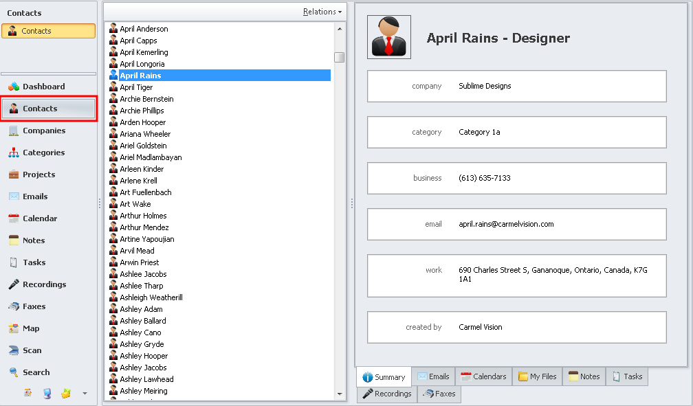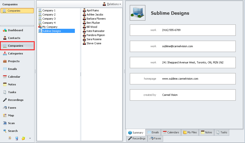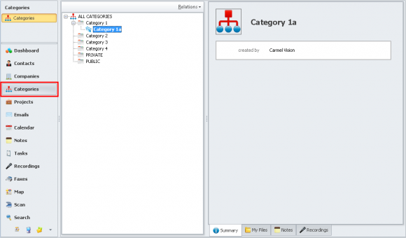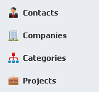 To view a list of entities, select either Contacts, Companies, Categories or Projects from the Left Tabbed Menu.