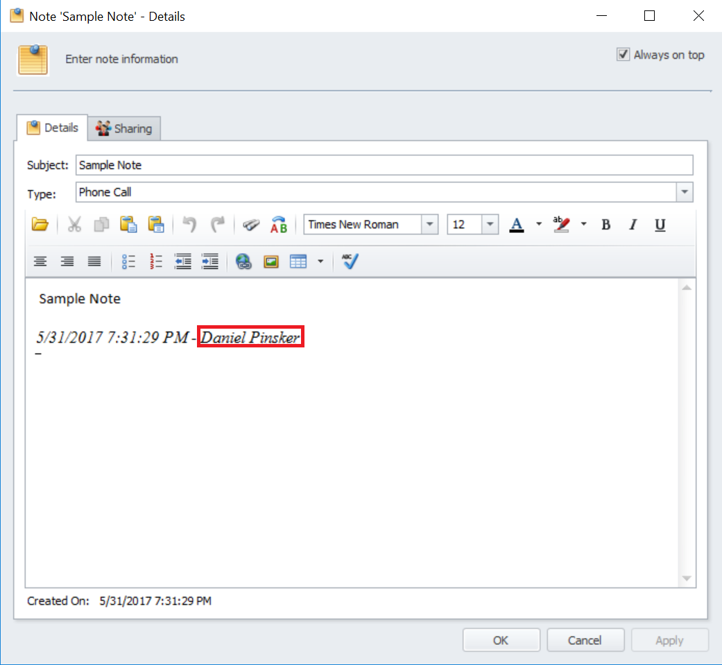This function will automatically include the name of the creator of the note
