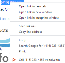 - on any webpage, highlight a phone number and right click to dial using right click menu. See example below. Desk phone will ring, pickup for call to connect.