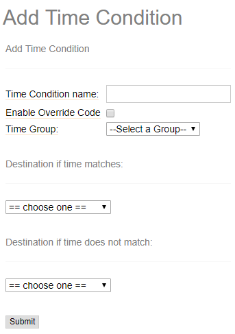 Time Conditions define a set of rules based on time groups. A time condition has two call destinations, one if the time of the call matches the time group assigned, and another if there is no match. Time conditions are often used to control how the system routes calls during business hours vs. outside business hours.
